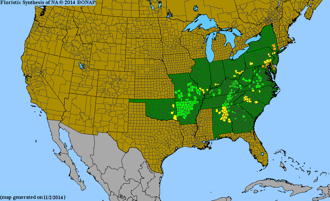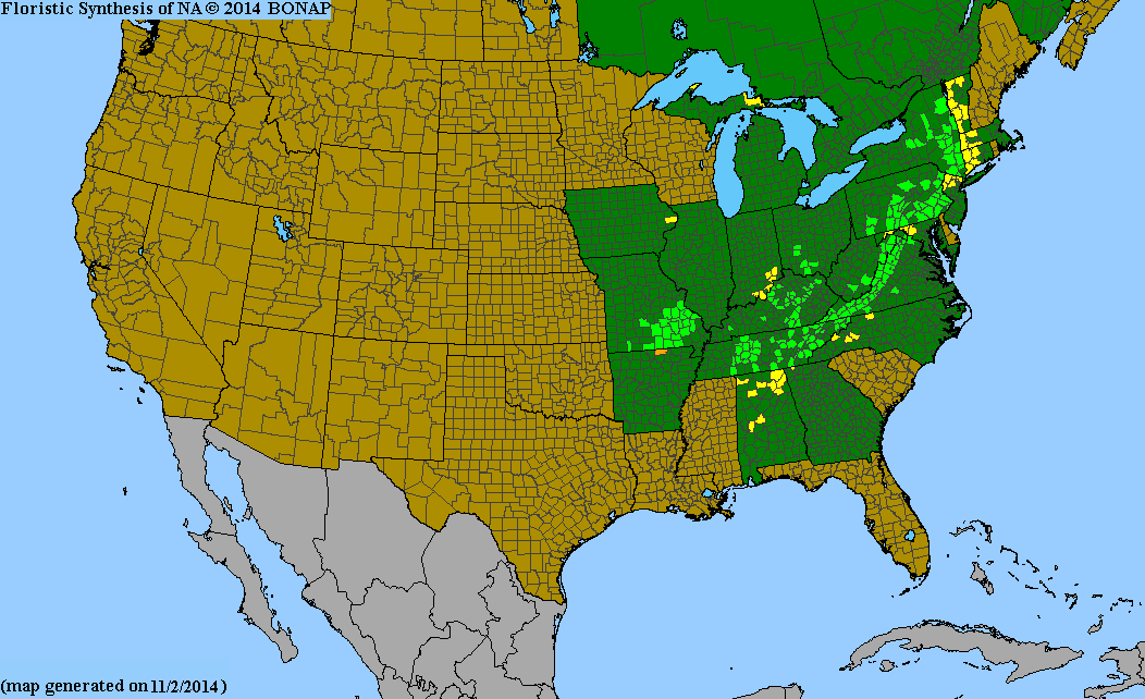| North American distribution of Bradley's Spleenwort (courtesy: BONAP) |